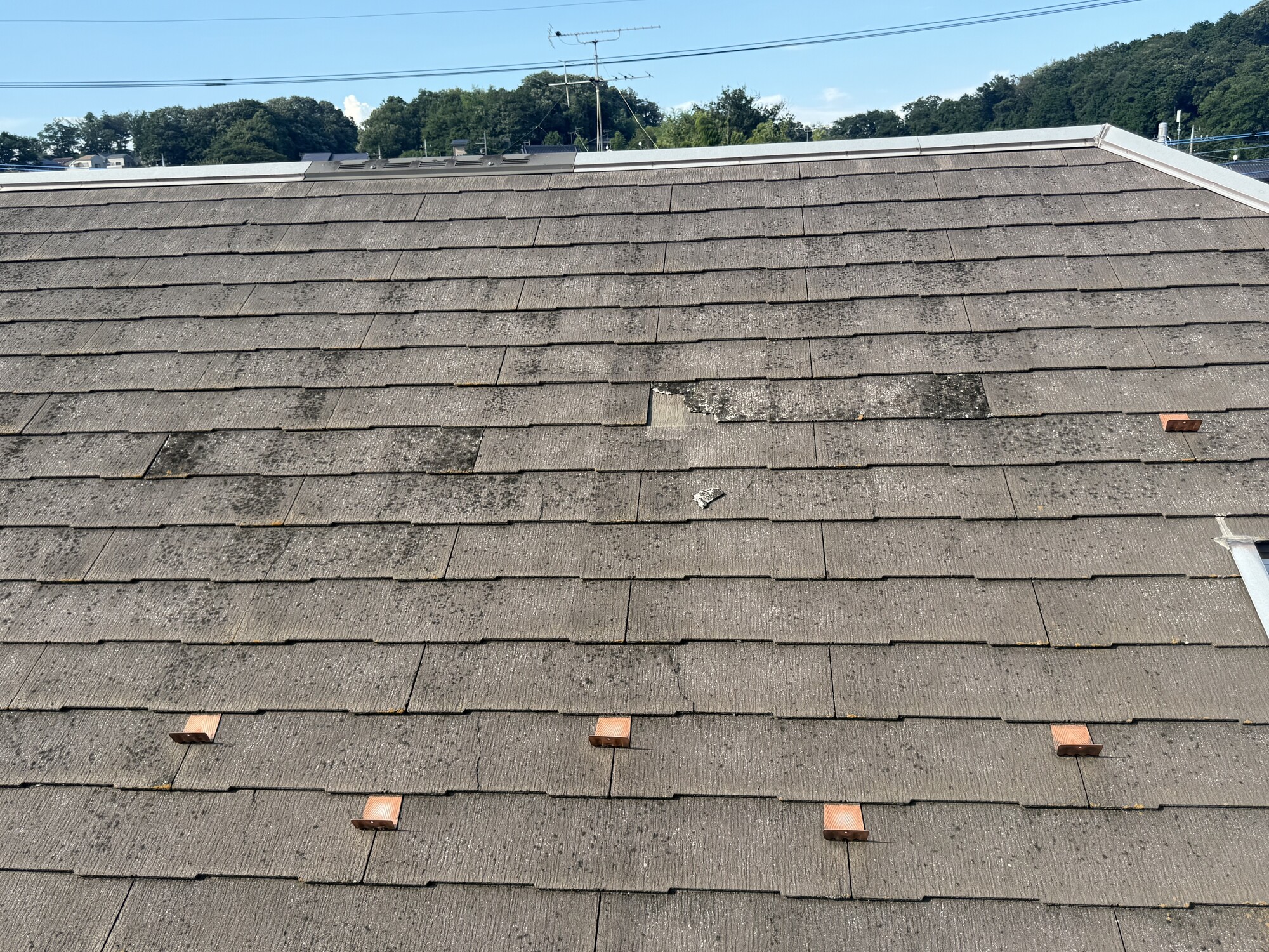 - 新築から16年が経過したノンアスベストの屋根材「コロニアルNEO」の劣化症状と、高圧洗浄後の瓦の変化になります。