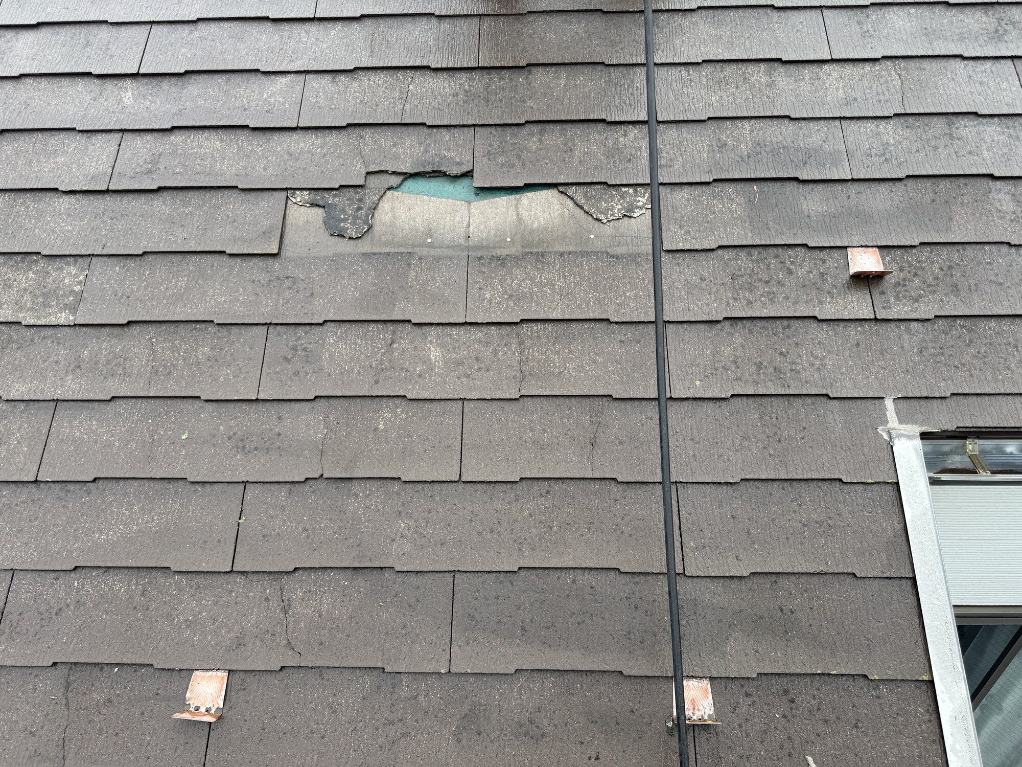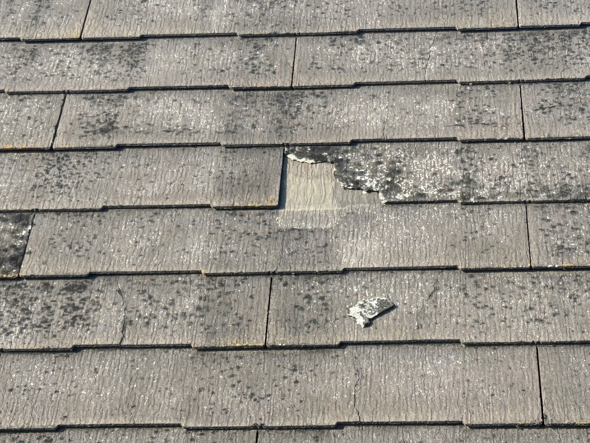 新しい屋根材を重ねる前には既存の屋根材(コロニアルNEO)を洗浄する必要があるため、高圧洗浄をしたところ、不良品の瓦は周りの瓦と比較しても明らかに脆くなっており、バキバキと割れて剥がれてしまいました。