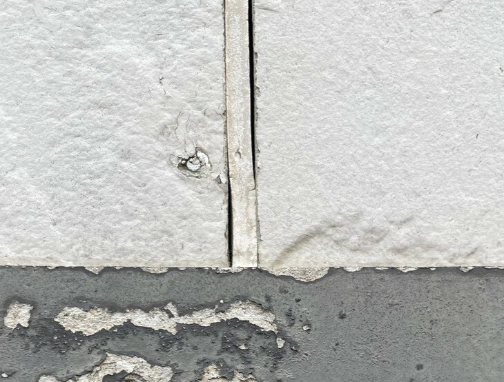 また、外壁同士の継ぎ目に充填されているシーリングにも隙間が見受けられ、釘周りを中心にひび割れも発生している状態でした。