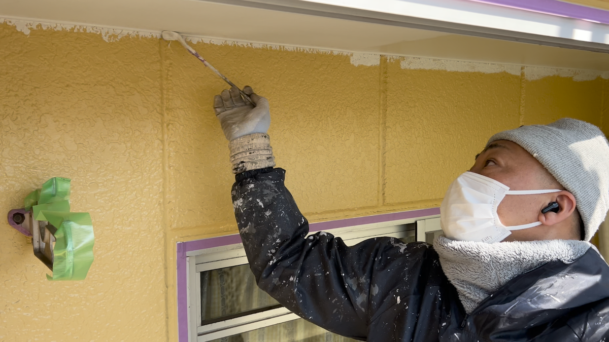 写真はベランダの天井(軒天)を塗装している風景です。(※ヘルメットを着用していませんが、ベランダ内での塗装なので落下の恐れはありません。ご安心ください)