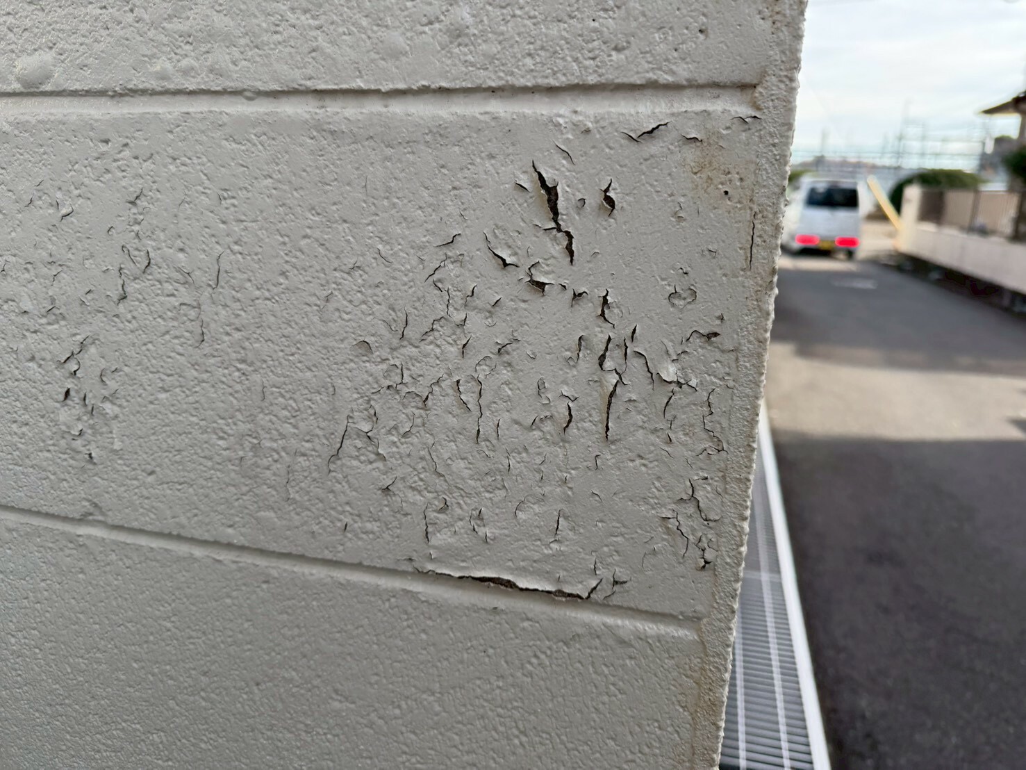 紫外線や雨風を直接受けた外構は、写真のように塗膜が細かくひび割れて剥離する"塗膜剥離"などの劣化症状が現れます。