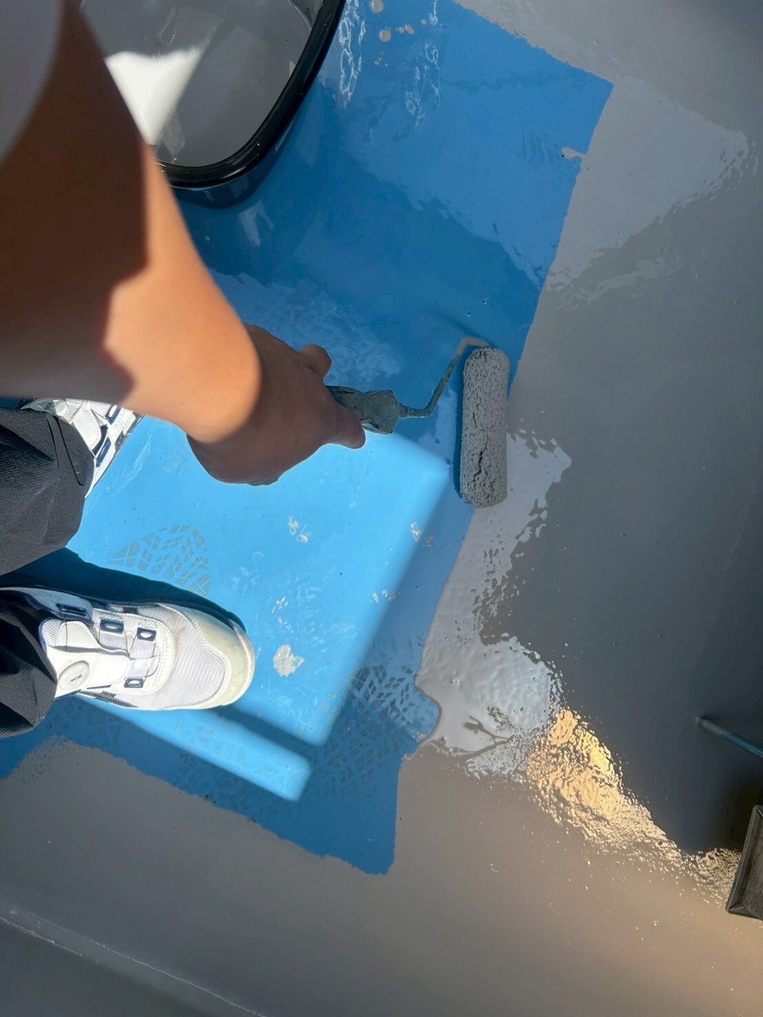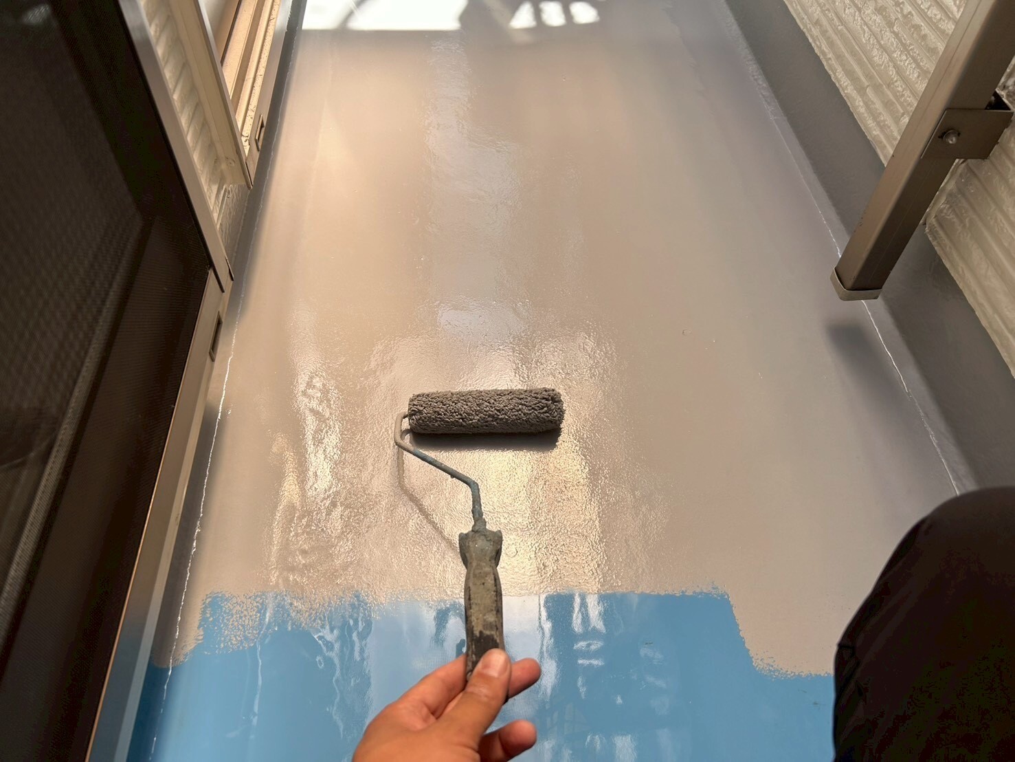 まず、浮いている防水層や剥がれた部分を丁寧に削り取り、ひび割れや段差を補修して平らに整えます。そのうえで、防水材をローラーで少しずつ塗り重ねていきます。最初は下地の色と防水材の色が分かれていますが、数回に分けて塗ることで、ムラのない防水層に仕上がります。立ち上がり部分や角などの細かい所は、ハケも使いながら塗布しました。