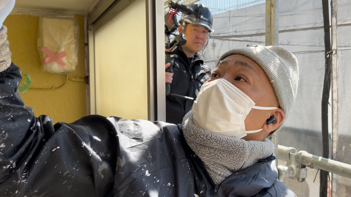 写真はベランダの天井(軒天)を塗装している風景です。(※ヘルメットを着用していませんが、ベランダ内での塗装なので落下の恐れはありません。ご安心ください)